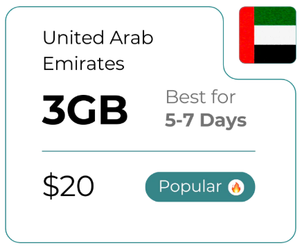 -   Связь: -   eSIM ОАЭ: пакеты данных от 1 ГБ до 20 ГБ, действительные в течение 30 дней.